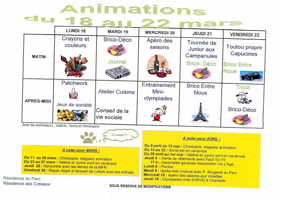 PLANNINGS SEMAINE DU 18 AU 22 MARS 2019